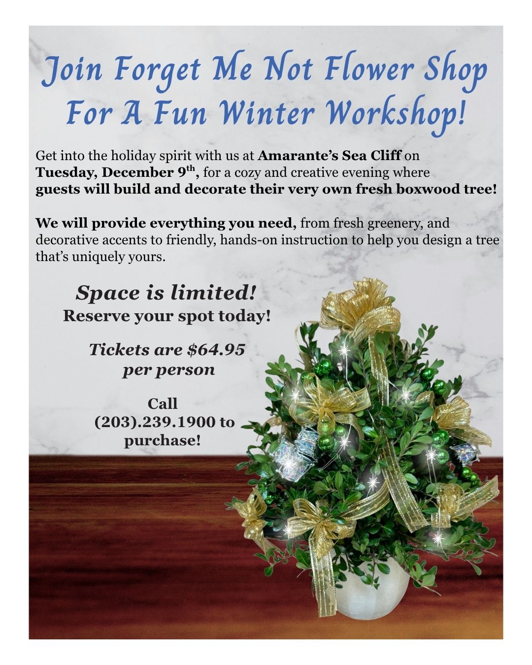 Get into the holiday spirit with us at Amarante’s Sea Cliff on Tuesday, December 9th, for a cozy and creative evening where guests will build and decorate their very own fresh boxwood tree!
