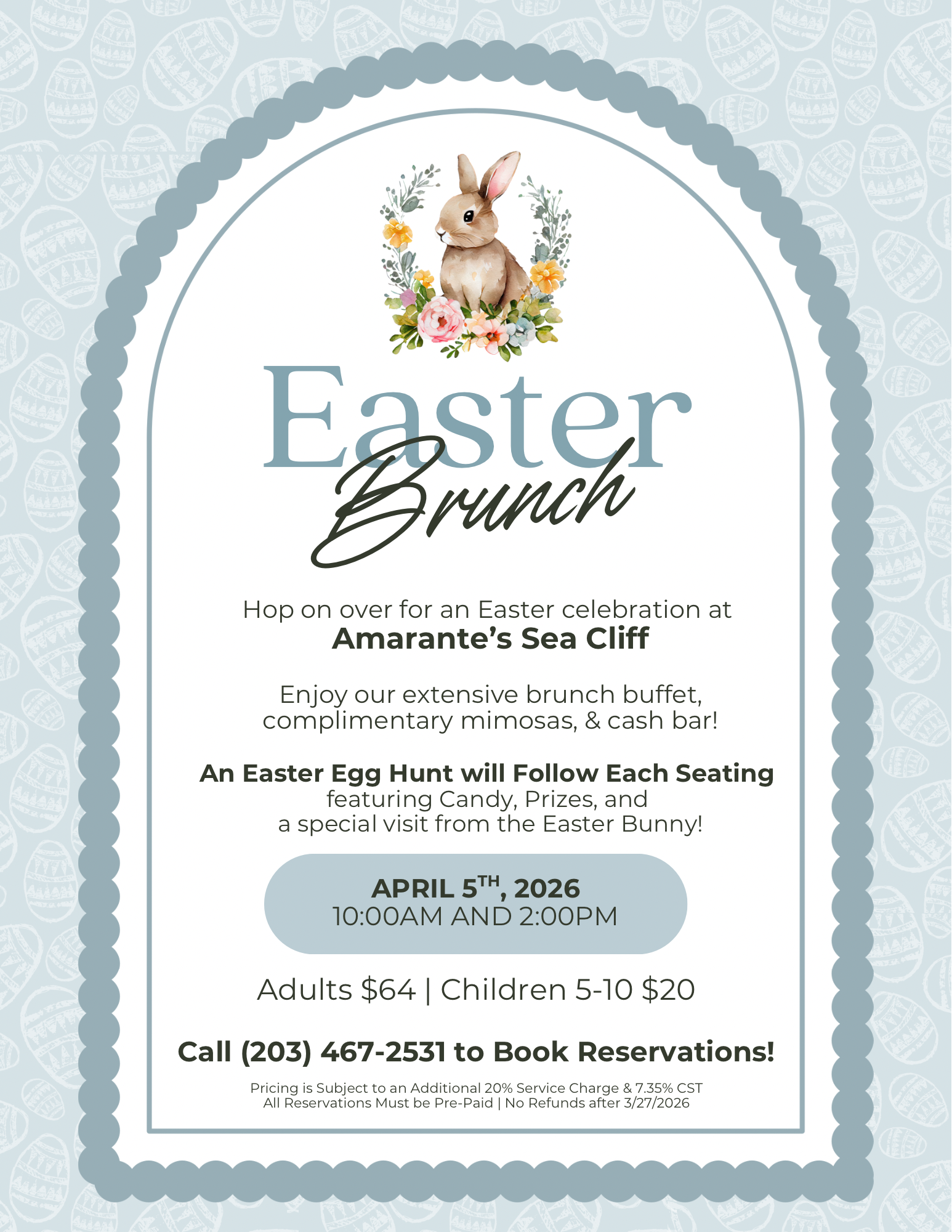 Join us for Easter Brunch featuring an extensive brunch buffet, complimentary mimosas, and a festive Easter Egg Hunt following each seating.