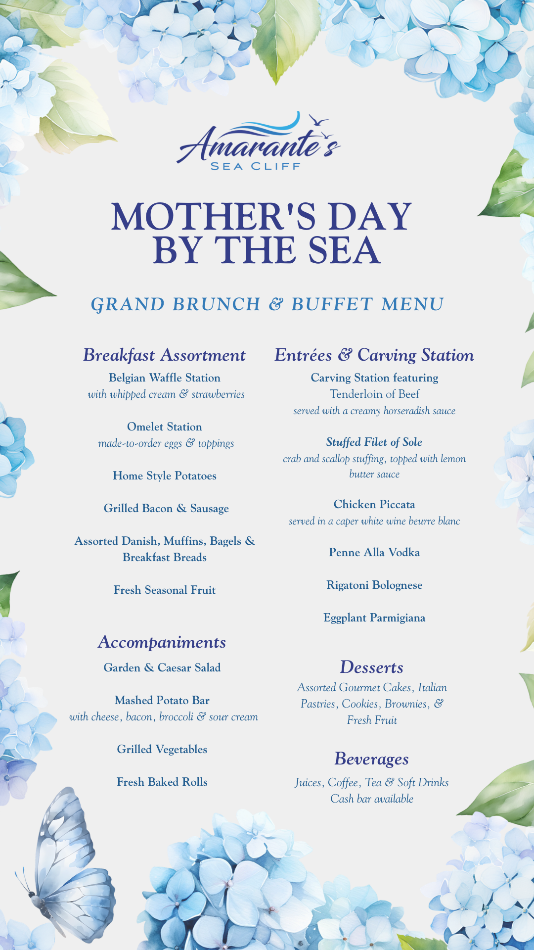 Join us for Mother’s Day by the Sea at Amarante’s Sea Cliff. Enjoy a grand brunch and buffet featuring delicious favorites, refreshing drinks, and breathtaking waterfront views—the perfect setting to celebrate and honor the moms you love.